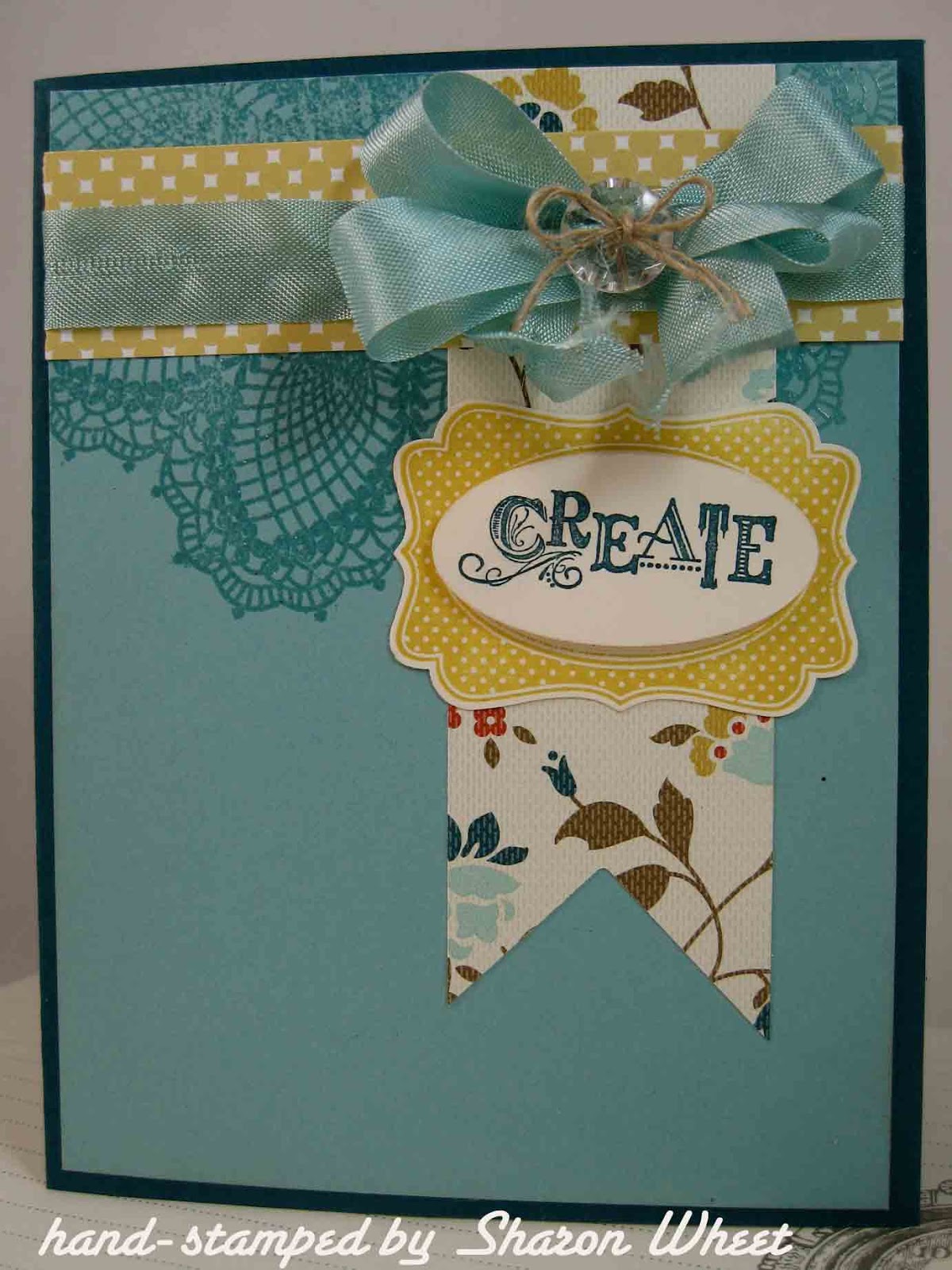 When creating this card, I used things that I love. The large background doily stamp, the four frames polka dot frame, some seam binding, a vintage faceted button, and a banner piece.